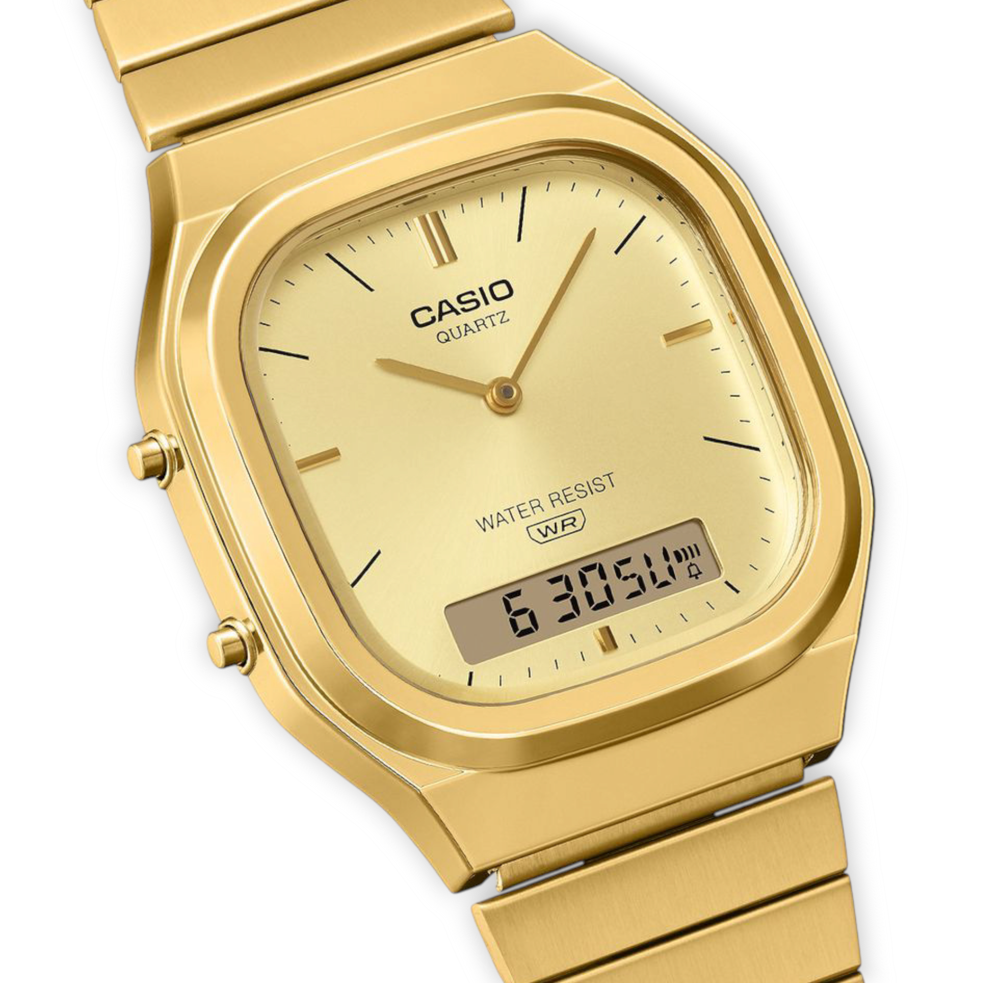 Give your retro style a modern twist, or your contemporary fashion a vintage touch. Either way you go, the refined and flowy AQ-240E strikes the right chord. The analog-digital AQ-240 with dual display goes retro-modern. With a slightly rectangular face offset by a gently rounded case and soft metal curves, this watch exudes sophistication.